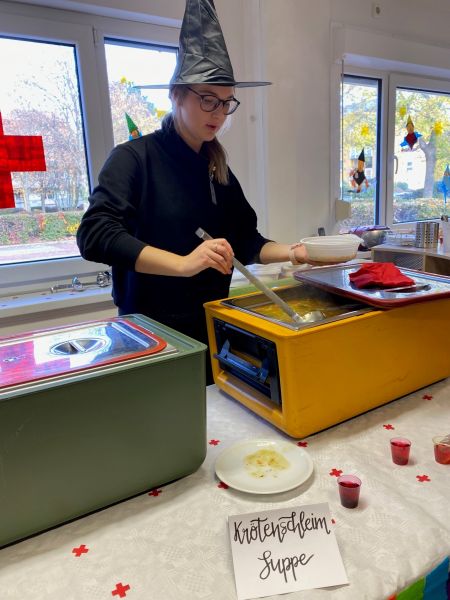 Anschließend konnten Groß und Klein die vielfältigen Angebote in den einzelnen Gruppen-Räumen nutzen. So bastelten die kleinen Nachwuchs-Magier*innen fleißig Zauberstäbe und Hexenhüte, während sich Mama & Papa Kaffee und den selbstgebackenen Kuchen der Kita-Mitarbeiter*innen schmecken ließen oder die „Krötenschleim“-Suppe (Erbsensuppe) kosteten, die der DRK-Ortsverein Holzwickede zubereitet hatte.
