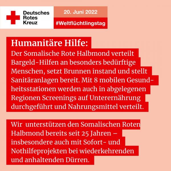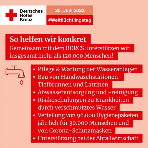 Dazu erklärt DRK-Generalsekretär Christian Reuter: Das DRK ist in der Ukraine, den Nachbarländern wie auch in Deutschland in der Hilfe für Geflüchtete aktiv. Darüber hinaus unterstützen wir geflüchtete Menschen in vielen Krisenregionen weltweit, beispielsweise Menschen aus Venezuela und Syrien, Geflüchtete und Binnenvertriebene in Bangladesch im Sudan, Jemen und in Uganda.“ Denn: „Die weitreichenden Auswirkungen des Ukraine Krieges führen auch dazu, dass sich die Situation in anderen Krisenregionen verschärft. Insbesondere lebenswichtige Grundnahrungsmittel werden plötzlich knapp. Deshalb möchten wir zum Weltflüchtlingstag daran erinnern, dass weltweit geflüchtete Menschen mehr denn je auf humanitäre Hilfe angewiesen sind.“