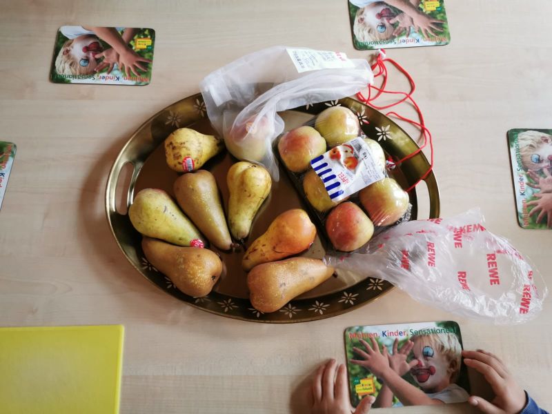 Außerdem galt es zu verstehen, dass Müll nicht nur ordentlich getrennt werden muss, wenn er schon da ist, sondern dass er auch im Vorfeld nach Möglichkeit vermieden werden kann. Zu diesem Zweck machten sich die Puzzlekisten-Kids auf den Weg in den Supermarkt und schauten ganz genau hin, wie sich Obst und Gemüse ohne Plastiktüten und –boxen transportieren lassen und was eigentlich gerade Saison hat. Wieder zurück in der Kita wurde der Inhalt der Einkaufskörbe dann gemeinsam zu leckerem Kompott verarbeitet. Schließlich ist auch das frische Kochen mit unverarbeiteten Lebensmitteln aus regionalem Anbau ein wichtiger Bestandteil einer nachhaltigen Lebensweise.