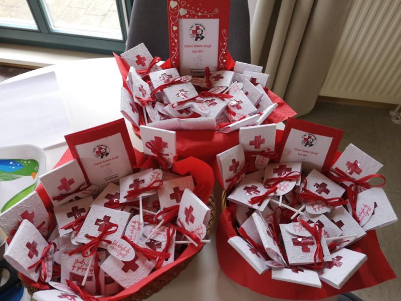 Mit Erfolg! So bastelten die Kinder der Holzwickeder DRK-Kita Hokuspokus bereits Tage vorher fleißig Deko, um das Gelände feierlich zu gestalten, in der Kita Nordlicht wurden Bilder gemalt und leckere Plätzchen für daheim gebacken und die kleinen Lippepiraten durften sich über einen riesigen Rotkreuz-Geburtstagskuchen freuen. Außerdem gab es das eine oder andere kleine Geschenk: Während die Kita Puzzlekiste in den Bönener Testzentren leckere DRK-Lollies ausgelegt hatte, konnten man sich in Werne auf dem Außengelände der Lippepiraten Lesezeichen mit schönen Sprüchen abholen.