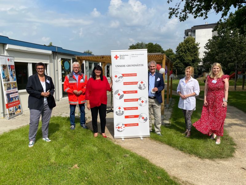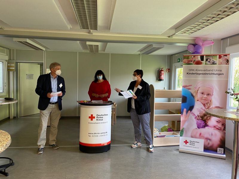 Mit Erfolg, wie die Eröffnung zeigte. „Denn mit einer Container-Landschaft, die lediglich als Übergangslösung gedacht ist, bis der Neubau steht, hat das rein gar nichts mehr zu tun“, freute sich der Vorstandsvorsitzende des DRK-Kreisverbandes Unna. Und auch die Lage erwies sich als Glücksgriff, denn „trotz der Kürze der Zeit konnten bereits tolle Kooperationen mit den Nachbarn geschlossen werden. So wird das Pertheszentrum unsere Kinder künftig mit einem leckeren Mittagessen versorgen und die Hellweg-Werkstätten werden sich um die Pflege unseres Außengeländes kümmern.