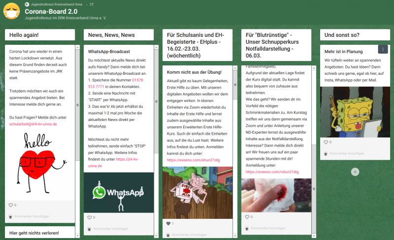 Auf ihrem „Corona-Board 2.0“ präsentieren die Jugendrotkreuzler*innen einen bunten Strauß unterschiedlichster Mitmach-Aktionen, damit man gar nicht erst in die Versuchung gerät, aus der Übung zu kommen, wichtige Erste-Hilfe-Kenntnisse zu verlernen oder die Freundinnen und Freunde aus der Gruppenstunde zu vermissen.