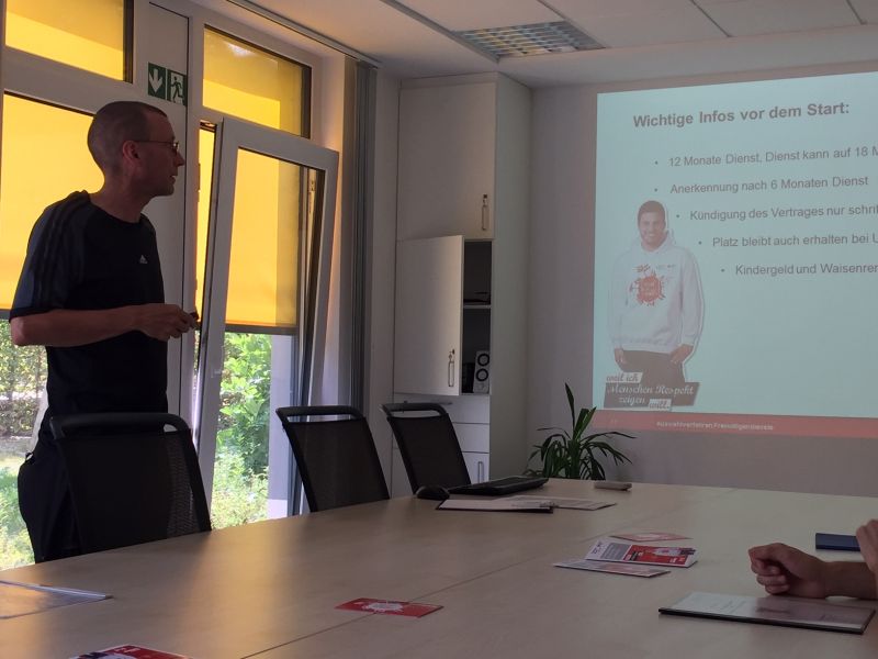8 neugierige – und vermutlich auch ziemlich aufgeregte – Gesichter schauen Ingmar Uhrich an diesem morgen entgegen. Routine für den stellvertretenden Fachbereichsleiter der Freiwilligendienste beim DRK-Kreisverband Unna. Zweimal pro Woche halten er oder eines seiner Teammitglieder vor interessierten Bewerberinnen und Bewerbern einen rund einstündigen Vortrag über den Freiwilligendienst in Trägerschaft des DRK.