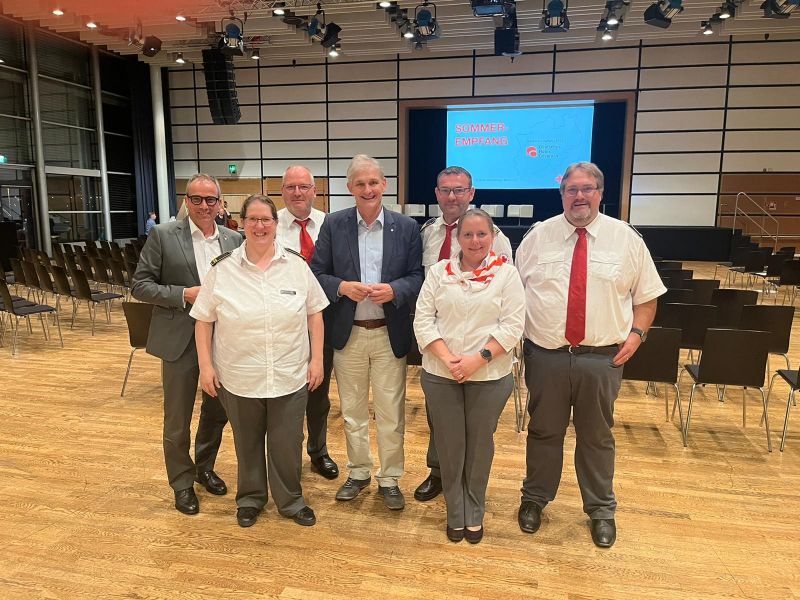 Sich mit anderen Rotkreuzler*innen austauschen, gespannt den Ansprachen der Kolleg*innen lauschen und angenehme Gespräche führen. - Vergangenen Dienstag luden der Landesverband Nordrhein und der Landesverband Westfalen Lippe zweijähriger Pandemie-Pause endlich wieder zum Sommerempfang auf den Düsseldorfer Rheinterrassen ein.