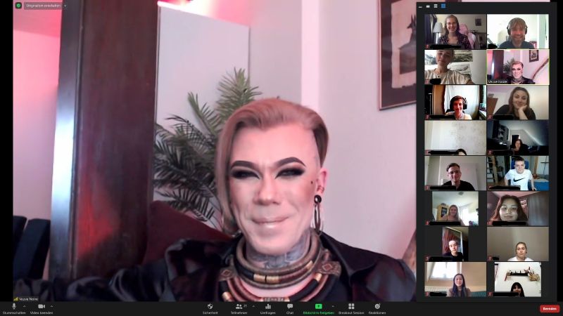 In einem spannenden Online-Workshop berichtete Veuve Noire anschaulich über ihren Lebensweg – von der Kindheit und Jugend in einem kleinen Dorf über ihr Coming-Out mit 17, Gewalt, Mobbing und Anfeindungen bis hin zu ihrem Weg nach Hamburg und in die Olivia-Jones-Familie. Dabei erklärte die Familienbotschafterin verschiedene Begrifflichkeiten der Szene und zeigte deutlich auf, wie Diskriminierung in Deutschland heute aussehen kann.