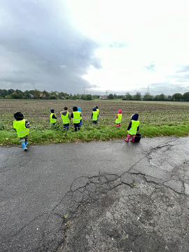 Gemeinsam mit ihren Erzieher*innen und Abfallberaterin Dorothee Weber von der GWA Kreis Unna sind die größeren Abenteuerland-Kids der Gruppe Löwenbande unterwegs, um die Natur um ihre Kita vom Müll zu befreien. Dabei sind sie bestens ausgestattet: Zusätzlich zu den obligatorischen Müllsäcken und Eimern hatte Dorothee Weber nämlich auch viele praktische Müllpieker und gut sichtbare gelbe Warnwesten im Gepäck, um beim Streifzug durch die Umgebung nicht übersehen zu werden.