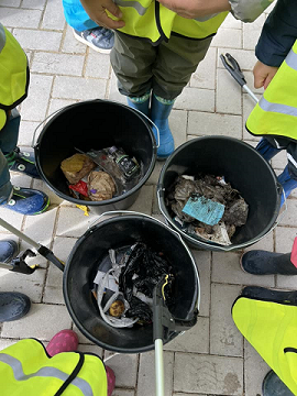„Das ist Schokoladen-Müll“, haben die Kinder der Kamener DRK-Kita Abenteuerland schnell identifiziert und befördern die leere Plastikverpackung eines Schokoriegels geschickt mit dem Müllpieker in ihren Eimer.