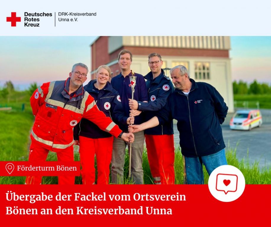 Vier Vertreterinnen und Vertreter des DRK-Ortsvereins Bönen nahmen die Fackel in Selm feierlich entgegen. Übergeben wurde sie dort von Jesaja Michael Wiegard, Schatzmeister des DRK-Ortsvereins Selm. In Bönen fand am Förderturm die nächste Übergabe statt: Rotkreuzleiter Matthias Pelz überreichte das Licht an Sebastian Bunse vom DRK-Kreisverband Unna, der die Fackel schließlich weiter in Richtung Wattenscheid brachte.