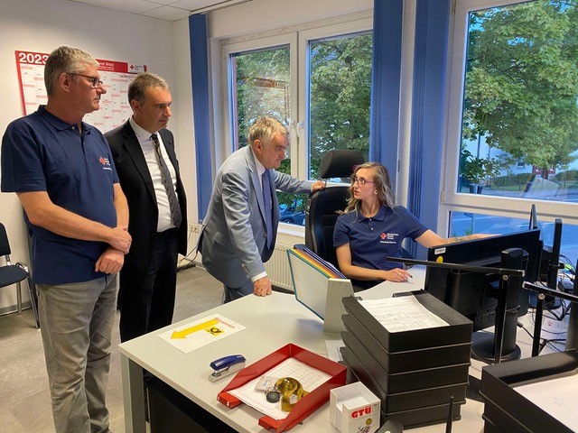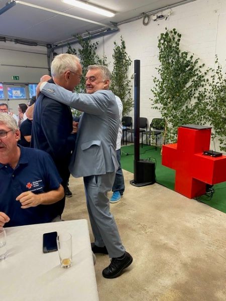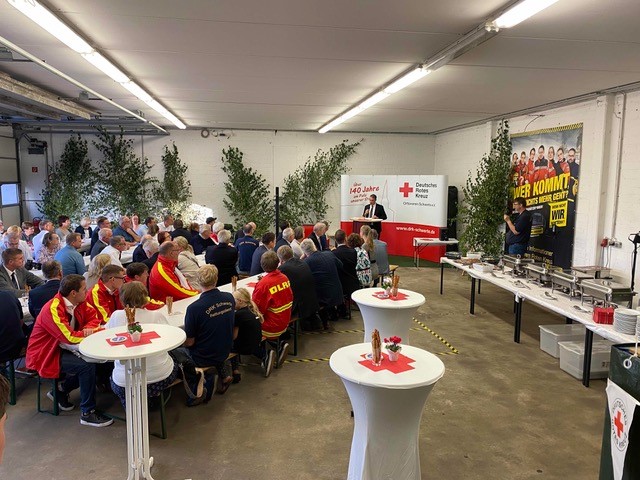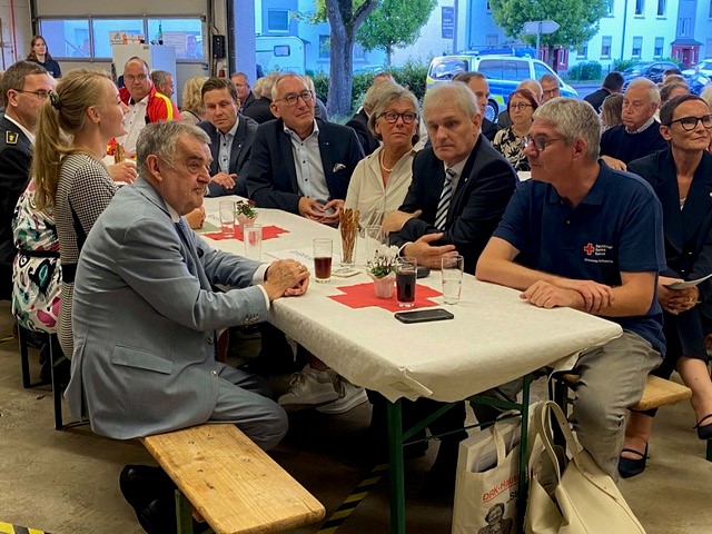Sowohl Nachfolger Franco Reale als auch der Präsident des DRK-Kreisverbandes würdigten Heinrich Böckelühr mit herzlichen Worten und der einen oder anderen Erinnerungs-Anekdote. Besonderes Highlight war allerdings ein Überraschungsgast, von dem im Vorfeld nur die wenigsten wussten. Kurz vor Beginn der Moderation durch Kreisverbands-Vorständin Christine Scholl, vor am geöffneten Rolltor eine schwarze Limousine vor, der NRW-Innenminister Herbert Reul entstieg.
