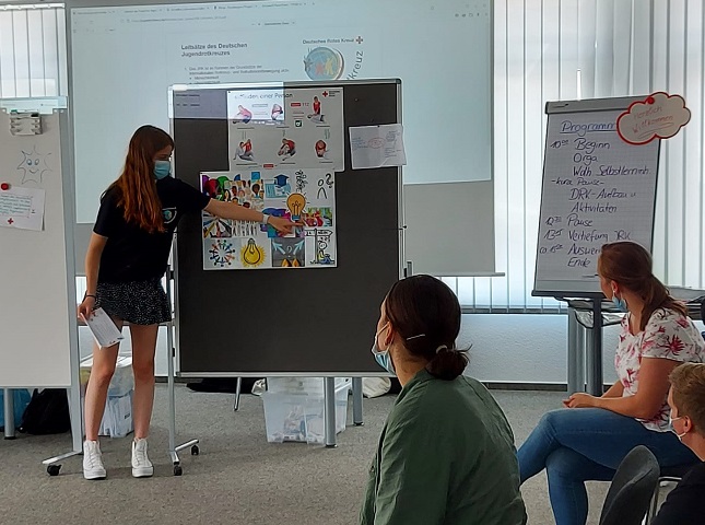 Aber natürlich war auch das inhaltliche Programm wieder bestens gefüllt mit vielen interessanten Themen rund um das Rote Kreuz und seine Jugendorganisation. So standen u.a. die Geschichte, der lokale, nationale und internationale Organisationsaufbau und die sieben Rotkreuz-Grundsätze auf der Agenda. Zudem lag der Fokus auf den praktischen Schwerpunkten der JRK-Arbeit im Ortsverein sowie den Möglichkeiten zur Mitarbeit im Kreis- oder Landesverband.