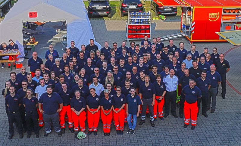 Damit das bei Bedarf wie aus dem FF umgesetzt werden kann, trafen sich am Montag alle verantwortlichen Einheiten am Kreis-Feuerwehr-Service-Zentrum in Unna. Mit dabei waren: die Einsatzeinheit 3 (DRK Ortsverein Unna e.V., DRK-Ortsverein Schwerte e.V., DRK-Ortsverein Holzwickede e.V. und DRK Ortsverein Fröndenberg e.V.), die Einsatzeinheit 2 (DRK Ortsverein Kamen e.V. und DRK Ortsverein Bönen e.V.), der Fernmeldedienst des Kreises Unna, der Rettungsdienstzug des Kreises Unna und natürlich die Feuerwehr Unna. Allein vom DRK im Kreis Unna waren somit 53 Einsatzkräfte vor Ort.