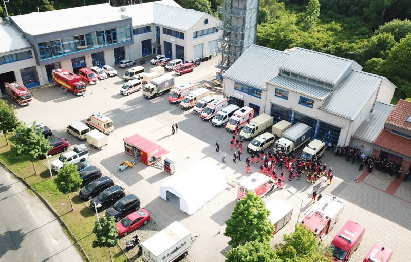 Los ging es dort – genau wie im Ernstfall – mit der Registrierung der eintreffenden Kräfte und der Zuweisung der jeweiligen Stellplätze. Anschließend wurde auf der Außenfläche des Feuerwehr-Service-Zentrums die einzelnen Bestandteile des BHP 50 aufgebaut und vorgestellt. Vorgabe: Fertigstellung innerhalb von 45 Minuten und die Kapazitäten zur Versorgung von rund 50 Patienten pro Stunde. Zeitgleich errichtete der Rettungsdienstzug zu Demonstrationszwecken ein Behandlungszelt, in dem auch eine intensivmedizinische Grundversorgung möglich ist.