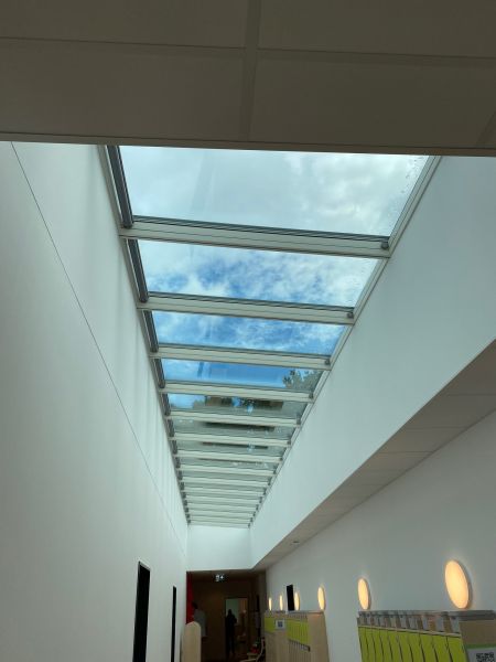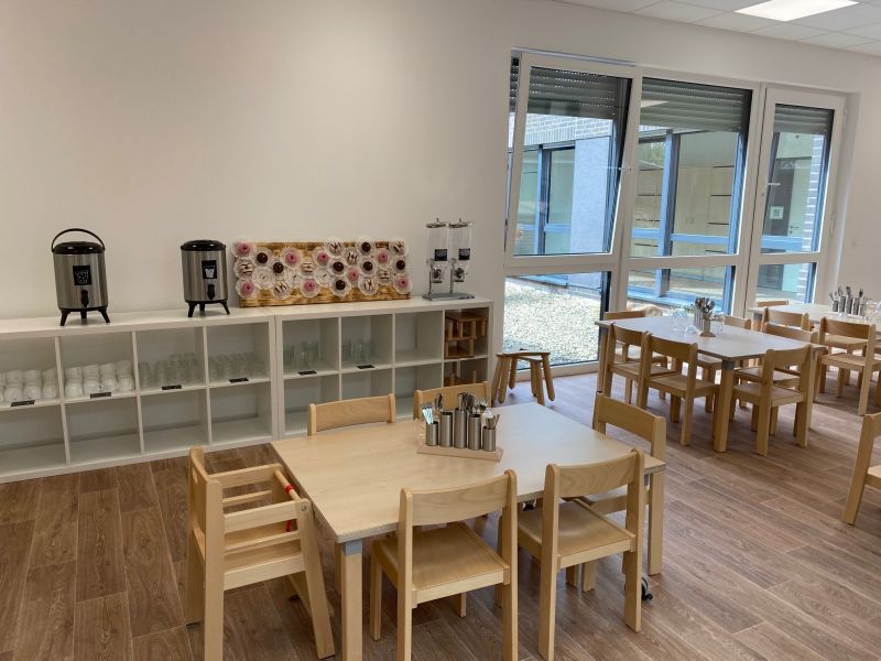 Dabei wurde in der Ausgestaltung der Räumlichkeiten nichts dem Zufall überlassen, wie Architekt Benthaus schilderte: Wir haben das Thema Wald im Gebäude immer wieder auf unterschiedlichste Weise aufgegriffen, um die Natur in die Innenräume zu holen. Ein Plan, der mehr als gelang, wie sich beim anschließenden Rundgang alle Besucher*innen überzeugen konnten. So bieten überall große, bodentiefe Fenster einen freien Blick auf den umliegenden Wald, Lichtbänder in den Flur-Decken geben dem Besuch das Gefühl unter freiem Himmel zu stehen und als besonderes Highlight wurde angrenzend an das Kinderrestaurant ein Atrium gebaut, in dem die Kinder auch beim Essen jederzeit die Natur beobachten können.
