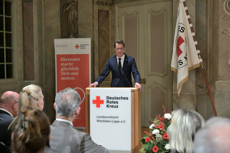 Die Festrede hielt der Ministerpräsident des Landes Nordrhein-Westfalen Hendrik Wüst: „Kriege, Katastrophen, Krisen: Der Zusammenhalt einer Gesellschaft beweist sich nicht allein, aber doch vor allem in herausfordernden Zeiten. Nächstenliebe, Mitmenschlichkeit und Solidarität zeigen sich in diesen Tagen wieder an der Hilfsbereitschaft an vielen Stellen in unserem Land und weit über seine Grenzen hinaus. Das ist auch dem Deutschen Roten Kreuz zu verdanken. Hier steht der Mensch im Mittelpunkt, ob bei einem internationalen Hilfseinsatz oder bei der täglichen Arbeit vor Ort, während der Corona-Pandemie und der Hochwasserkatastrophe, genauso wie in der Wohlfahrtspflege, im Rettungswesen oder in der Jugendarbeit. Viele ehrenamtlich aktive Mitglieder und hauptamtliche Mitarbeiterinnen und Mitarbeiter setzen sich beim DRK-Landesverband Westfalen-Lippe für die Gesundheit, die Würde und das Wohlergehen der Menschen in der Region, in Nordrhein-Westfalen und in aller Welt ein. Für diesen Einsatz gebührt Ihnen unser Respekt und Dank“, sagte der Ministerpräsident.