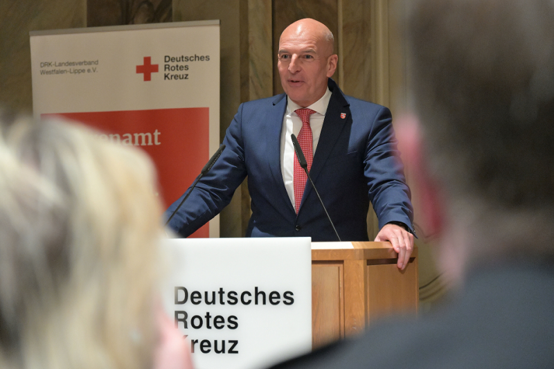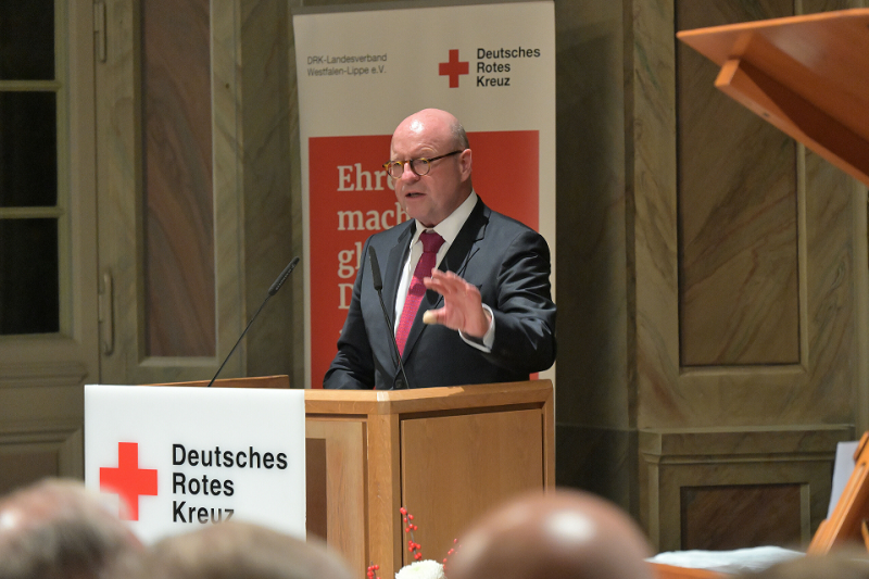 Auch der Direktor des Landschaftsverbandes Westfalen-Lippe (LWL), Dr. Georg Lunemann, und der Oberbürgermeister der Stadt Münster, Markus Lewe, würdigten die Leistungen des Roten Kreuzes für das Gemeinwohl in Westfalen-Lippe. Dabei beschrieb Dr. Georg Lunemann einige Gemeinsamkeiten von LWL und DRK, zum Beispiel die Zielrichtung: „Wir wollen das Gute für die Menschen.“ „Die Menschen vertrauen Ihnen, dem Ehrenamt, dem Hauptamt“ so Markus Lewe in Richtung der Rotkreuzlerinnen und Rotkreuzler im Saal.