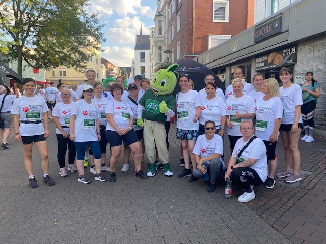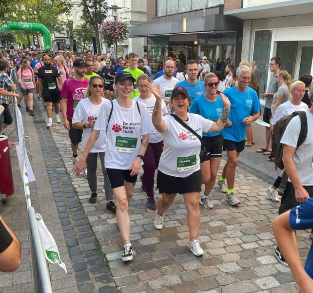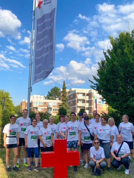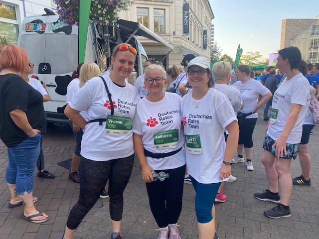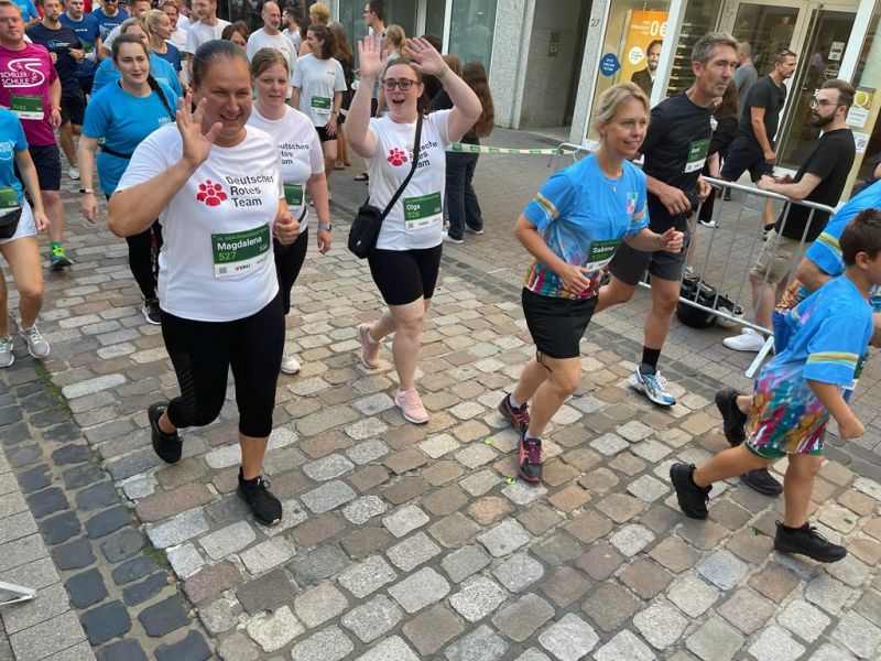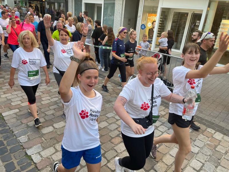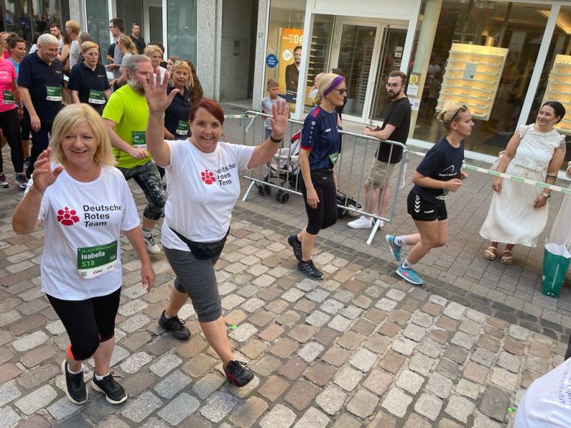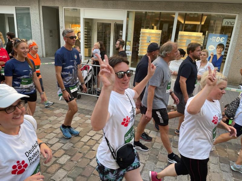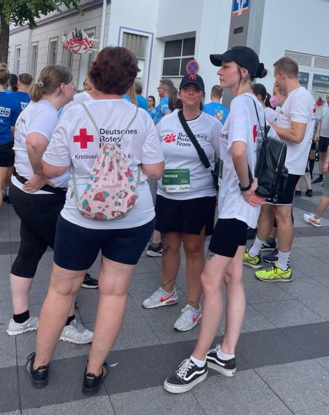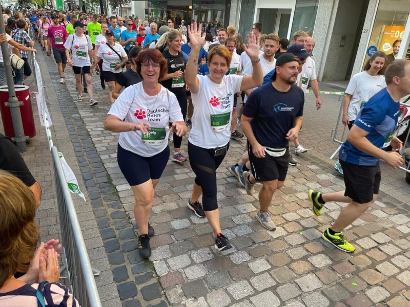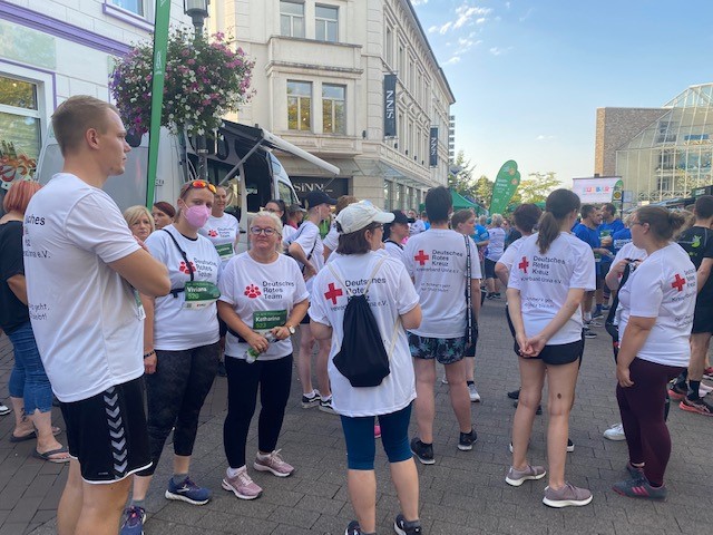 Ausgestattet mit der „Deutsches Rotes Team“-Shirts traf sich die bunt gemischte Gruppe aus Mitarbeitenden der Verwaltung, der Freiwilligendienste und der Kitas am frühen Abend an der Geschäftsstelle des Kreisverbandes. Nach der Startnummernvergabe und dem obligatorischen Gruppenfoto ging es von dort aus gemeinschaftlich und bester Laune im entspannten Spazierschritt Richtung Rathausplatz.