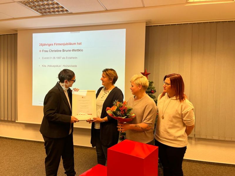 Entgegen der früheren Tradition, diese Ehrung im Rahmen einer großen Betriebsversammlung durchzuführen, fand in kleinem du somit sehr persönlichen Kreis statt. Mit liebevollen Details war der Besprechungsraum der Kreisverbands-Geschäftsstelle hierfür vorweihnachtlich dekoriert worden und lud mit Snacks und Getränken zum Verweilen ein.