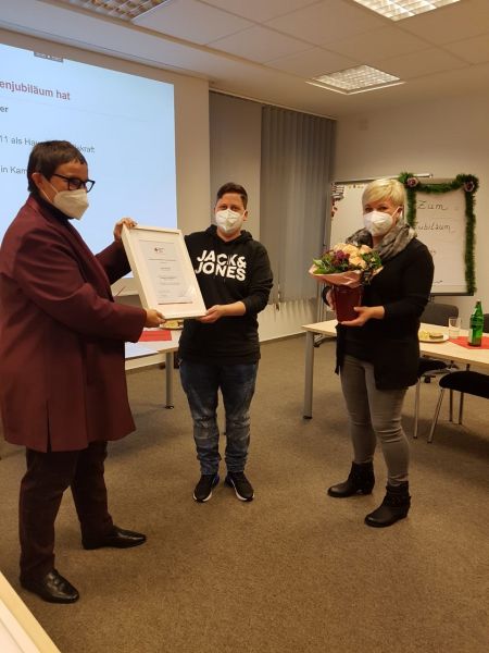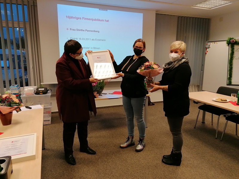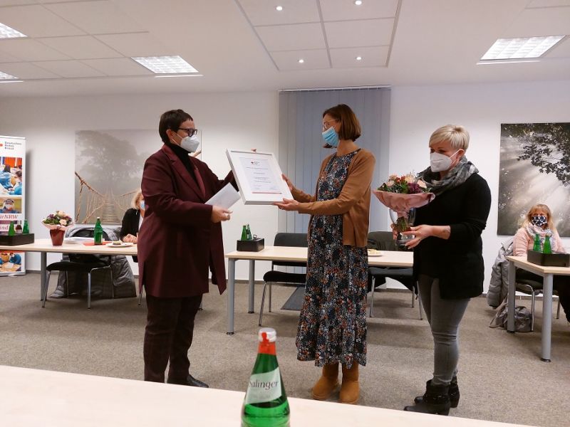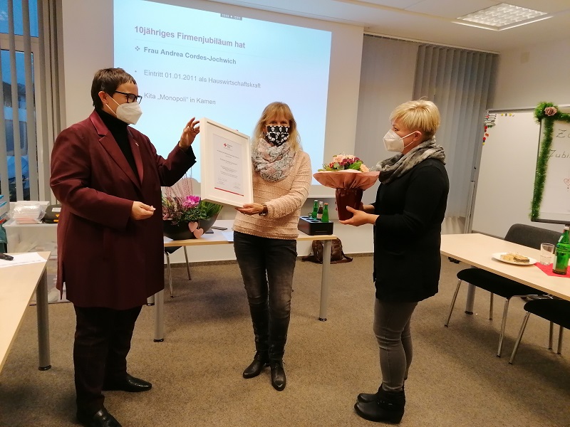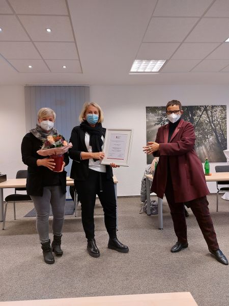 Entgegen der üblichen Tradition, diese Ehrung im Rahmen einer großen Betriebsversammlung durchzuführen, fand die Feierstunde dieses Mal – coronabedingt – in kleinem Kreise aus den Jubilarinnen, der Betriebsratsvorsitzenden Barbara Hötte und Kreisgeschäftsführerin Christine Scholl statt. Mit liebevollen Details war der Besprechungsraum der Kreisverbands-Geschäftsstelle dafür schon einmal vorweihnachtlich dekoriert worden und lud mit Kaffee und Kuchen zum Verweilen ein.