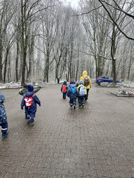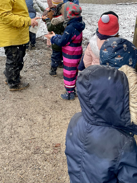 Morgens um 8:30 Uhr traf sich die Gruppe – dem Wetter entsprechend dick eingepackt – vor der Kita, um einen letzten „Hose-über-die-Schuhe-Check“ zu machen und die Anwesenheit zu kontrollieren. Doch bevor es schließlich losgehen konnte, mussten noch zwei Kinder als Waldhüter*innen auserkoren werden. Ihre Aufgabe war es, der Gruppe den Weg in Wald zu weisen und sie „vorzuwarnen“, falls ihnen zum Beispiel der Weg von einem Auto oder einem im Wald herumliegenden Baumstamm versperrt wird.