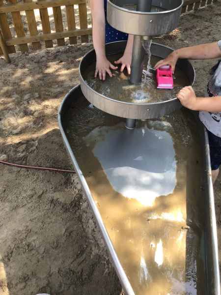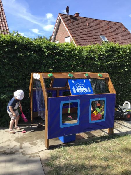 So hat die beliebte Bobbiecar-Rennstrecke eine Waschanlage bekommen, in der die kleinen Rennfahrer*innen ihre Flitzer nun nach Herzenslust mit Schwamm und Wassereimer reinigen können und im Sandkasten kann in neuen Matschküchen so richtig schön gewühlt und sich auch mal dreckig gemacht werden. Außerdem konnte sich die Naturbaustelle, auf der die Kinder mit kleinen Baggern und Baufahrzeugen werkeln können, über reichlich neue Baumaterialien freuen.