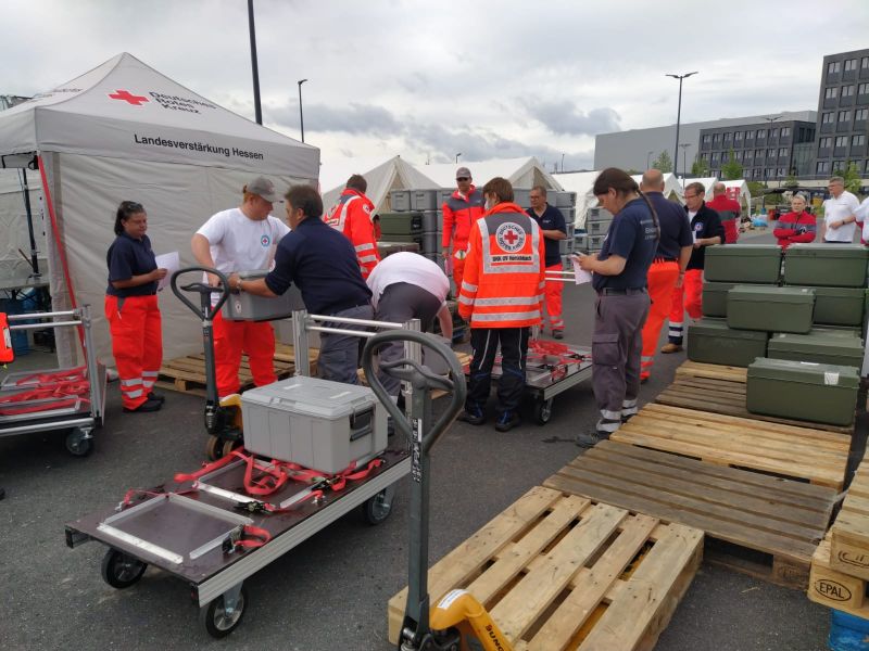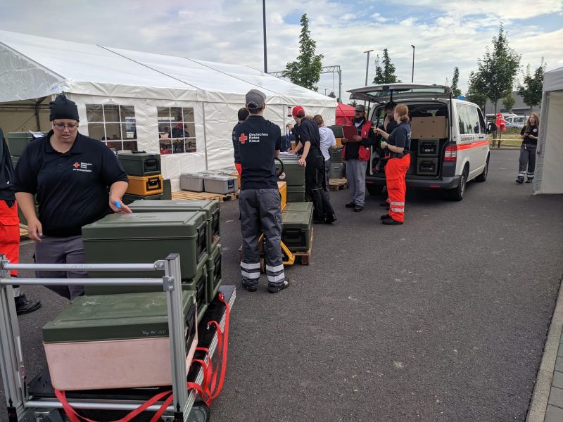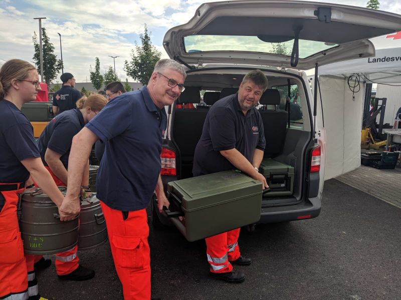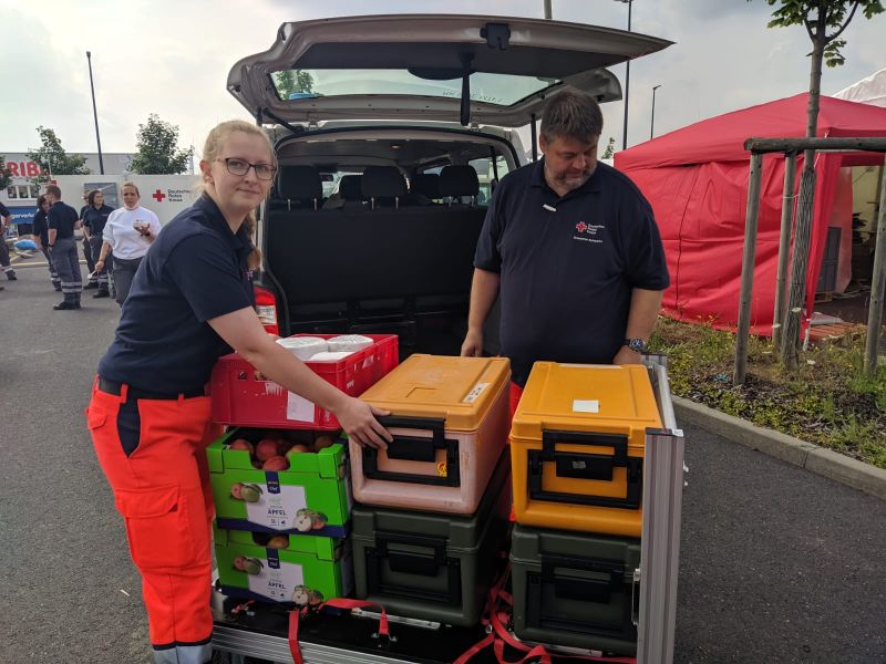 Hierzu hat das DRK rund 3 km vom Schadensgebiet entfernt – auf dem Firmengelände von Haribo – eine riesige Zeltstadt errichtet, die die logistischen Möglichkeiten für der Verpflegung einer solch großen Personenzahl bietet. Von hier aus werden die 10.000 Mahlzeiten dann an diverse dezentrale Ausgabestellen im Stadtgebiet verteilt, um die betroffenen Bürgerinnen und Bürger möglichst nah und unkompliziert zu erreichen.