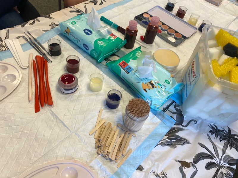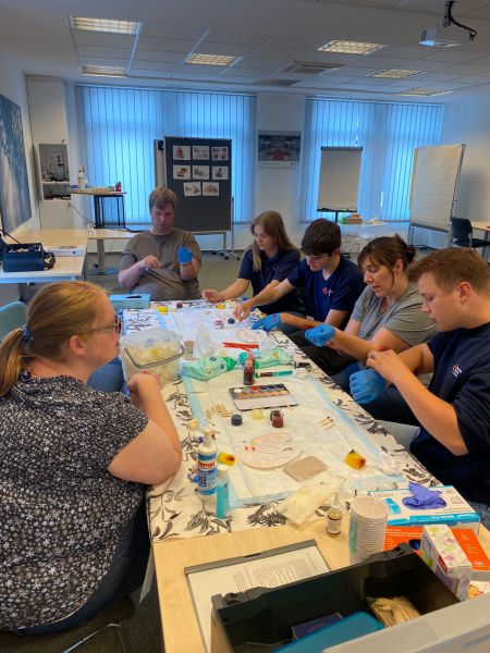„Ein äußerst spannendes und vor allem kreatives Aufgabenfeld der Rotkreuz-Arbeit“, waren die Kreisverbands-Mitarbeitenden begeistert. Unter Leitung von Viktoria Baues, der stellvertretenden JRK-Kreisleitung, griffen sie nach einer kurzen Einführung dann auch selbst gerne zu Farbtopf, Schwämmchen und Kunstblut-Spritze, um sich ihre eigenen Wunden aufzumalen. Dabei entwickelte der eine oder andere durchaus Ehrgeiz und werkelte akribisch an seinem Werk, bis der Hautton 100%ig passte und ein kleiner Blutstropfen stilecht aus der Wunde rann.
