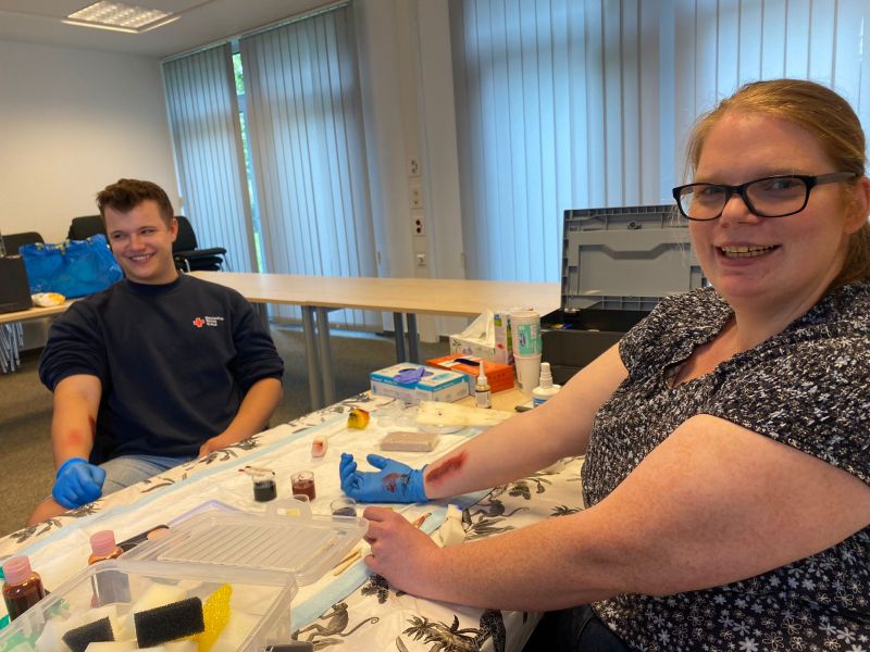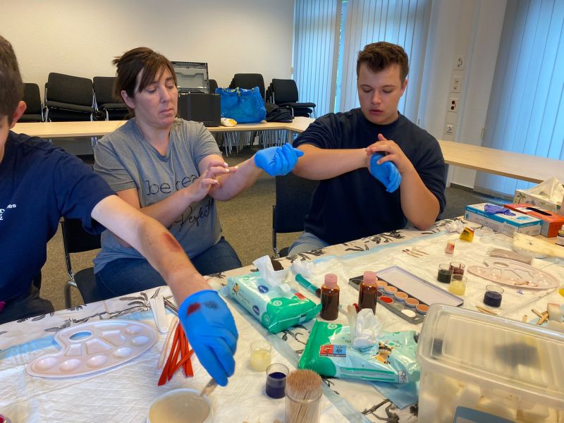 Mit Begeisterung üben die Kinder und Jugendlichen dort in ihren Gruppenstunden unter Anleitung das Schminken von Wunden. Hinzu kommt regelmäßiges theaterpädagogisches Training, um Verletzungen glaubhaft und ohne Übertreibung nachstellen zu können.