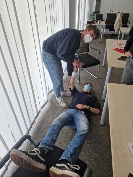 In der nächsten Einheit beschäftigte sich die Gruppe dann mit verschiedenen anderen medizinischen Notfällen, die z.B. im Hausnotrufeinsatz vorkommen können. So ging es u.a. darum, was ein Schock ist, und wie Patient*innen bei unterschiedlichen Schockformen, wie Blutverlust oder Verdacht auf Herzinfarkt, jeweils richtig gelagert werden sollten. Zudem wurde das Wissen über die Wundversorgung aufgefrischt.