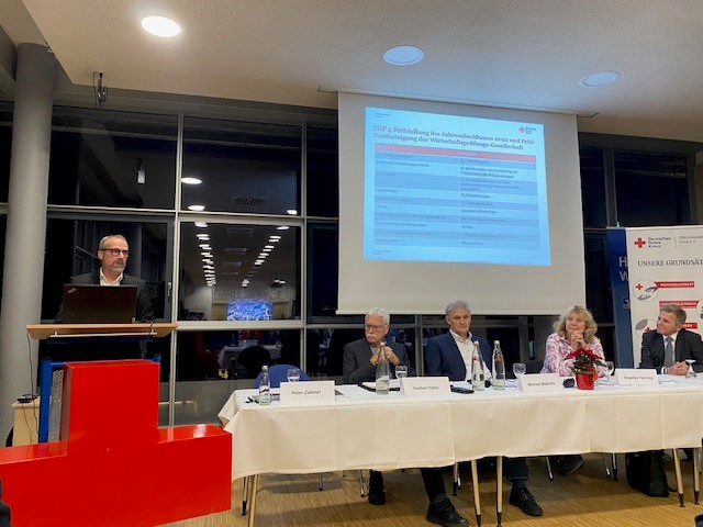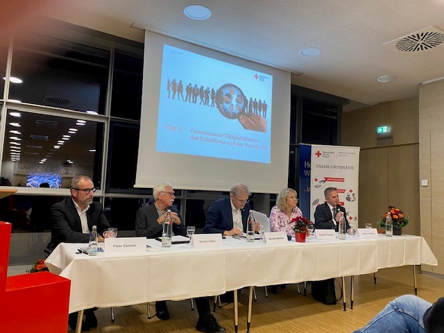 Doch das war nicht das einzig neue Gesicht in der Runde. Ganz vorne am Rednertisch saß neben der Präsidiumsspitze erstmals auch Johann Härtling, der den DRK-Kreisverband Unna künftig als Vorstand leiten wird. Kurz vor der Kreisversammlung war er vom Präsidium für 5 Jahre für dieses Amt bestellt worden und freute sich nun über die Gelegenheit zum Kennenlernen vieler künftiger Weggefährt*innen. Offizieller Dienstantritt ist dann zum 01.12., wenn Christine Scholl den Staffelstab nach knapp 5 Jahren auf eigenen Wunsch an ihren Nachfolger übergibt.
