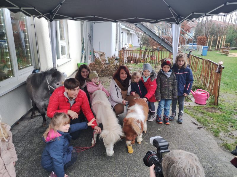Am 22.12. gab es Besuch von Reitlehrerin Carola Weidemann und ihren 3 Therapieponys Lion (grau), Goldi (beige) und Pumuckl (braun/weiß). Besonders Pumuckl ist dabei eine echte Bekanntheit. Immerhin steht das gerade mal 50 cm große Pony derzeit als kleinstes Pferd der Welt im Guinness-Buch der Rekorde.