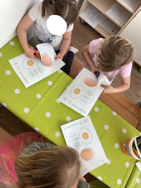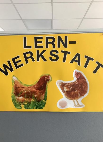 Durch einen Workshop konnten die Kinder bereits vor dem Aufenthalt der Hühner erstes Grundverständnis und -wissen für und über die Hühner erlangen. Auf spielerische Weise erfuhren sie, dass es verschiede Rassen gibt, die dementsprechend auch verschiedene Eier legen. – Die gelegten Eier wurden schließlich von unseren frisch gebackenen Hühner-Expert*innen eingesammelt und beim Frühstück in Form von Rührei, Spiegelei, einem gekochten Ei oder im Kuchen vernascht.