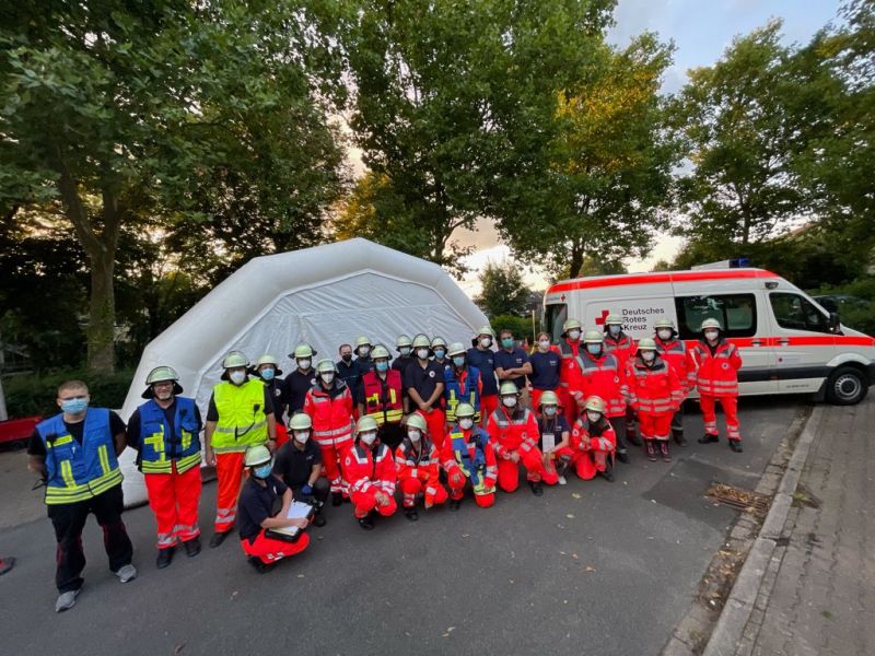 Geübt wurde in diesen neuen Konstellationen dann u.a. der Transport verletzter Personen, der Zeltbau zur Errichtung einer medizinischen Versorgungsstelle, die Stromversorgung im Einsatz, die Kommunikation über Sprechfunk, das Führen und Leiten von Einsatzgruppen sowie der Aufbau und Betrieb einer Betreuungsstelle inklusive der Registrierung von betroffenen Personen.