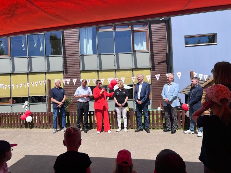 So starteten alle Teilnehmenden mit einigen Grußworten von der Vorständin des DRK Kreisverbandes - Christine Scholl -, unserem Präsidenten - Michael Makiolla - und dem Bürgermeister – Herr Orlowski – in die Veranstaltung. Gefolgt von den Kita-Kids mit ihrer Aufführung zu dem Lied „Wir sind die Kinder vom DRK“ und der offiziellen Eröffnung durch die Kita Leitung Frau Metzke.