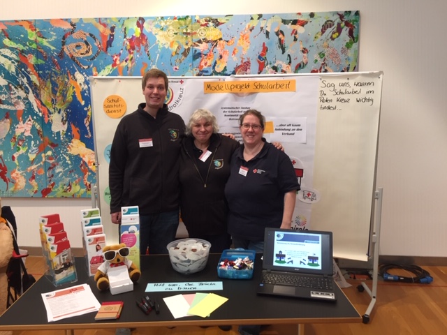 Auf dem „Markt der Möglichkeiten“ präsentierte das Unnaer Messe-Team um Projektkoordinator Sebastian Bunse, Jugendrotkreuzleiterin Regina Klose und Kreisrotkreuzleiterin Anika Knutti die unterschiedlichsten Möglichkeiten zur Zusammenarbeit zwischen Schule und JRK: Von der Etablierung eines Schulsanitätsdienstes, über Projekttage zur Gewaltprävention bis hin zur AG zum Thema „Humanitäre Schule“ gibt es hier Angebote für alle weiterführenden Schulformen und Altersklassen.