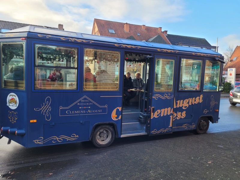 Nach der gemeinsamen Busanreise von Unna erreichte die Gruppe am späten Vormittag den Festort. Dort wartete zu allererst eine Fahrt mit dem Clemens-August-Express durch den winterlichen Wald inkl. Glühwein und heißem Punsch, ehe wenig später bereits ein reichhaltiges, traditionelles Weihnachtsessen auf alle wartete. Im Anschluss konnten die Reisenden über den haueigenen Weihnachtsmarkt stöbern und das eine oder andere Andenken oder kleine Geschenk für die Lieben daheim erwerben. Und auch die gegenüberliegende Kirche mit einer großen Krippe sorgte für Begeisterung und schöne Erinnerungen.