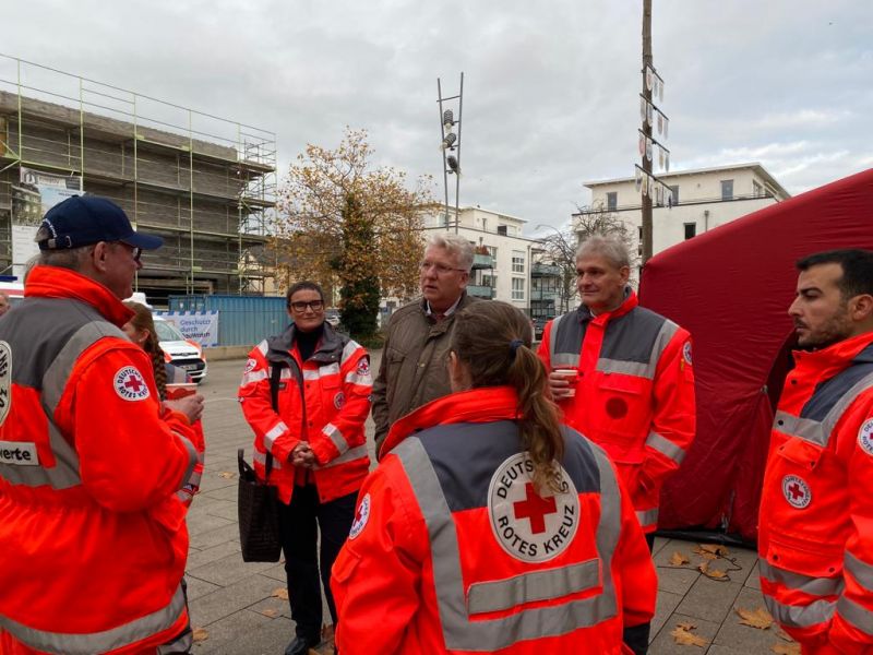 Mit von der Partie waren, neben den Einsatzkräften auch der Kreisverbandsvorstand mit Michael Makiolla und Norbert Hahn, die Kreisrotkreuzleitung um Robert Wettklo und Marko Wilke sowie Kreisgeschäftsführerin Christine Scholl. Gemeinsam begleiteten sie den Aktionstag, sprachen mit interessierten Bürger*innen und nutzten die Gelegenheit zum Austausch mit den Einsatzkräften. Diese Chance ließ sich auch Hartmut Ganzke, der Landtagsabgeordnete für Fröndenberg, Holzwickede, Schwerte und Unna nicht nehmen und schaute gerne auf dem Holzwickeder Marktplatz vorbei. Dort konnte er dann auch direkt eine kleine Vorführung des Betreuungstrupps bewundern, die zeigten, wie sich ihr Versorgungszelt innerhalb weniger Sekunden zu voller Größe und Standfestigkeit aufpusten lässt.