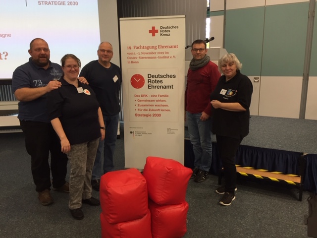 Klar, dass da auch die führenden Ehrenamtler aus dem Kreis Unna mitreden und ihre Ideen einbringen wollten. Mit unserem Kreisrotkreuzleiter Robert Wettklo, Kreisrotkreuzleiterin Anika Knutti, Stellvertreter Marko Wilke, Kreis-JRK-Leiterin Regina Klose und Andreas Lücke, seit mehr als 25 Jahren im DRK-Ortsverein Holzwickede aktiv, machte sich dabei eine engagierte und erfahrene Delegation auf den Weg nach Bonn.