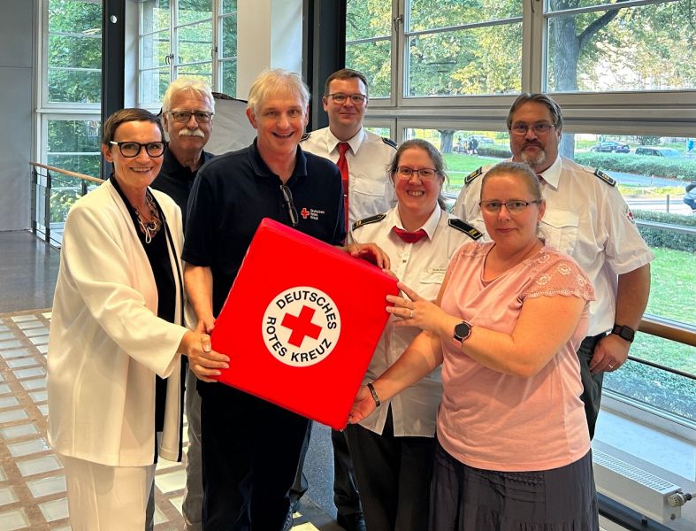 Mit von der Partie waren von links nach rechts: Christine Scholl (Vorständin), Norbert Hahn (Vizepräsident), Michael Makiolla (Präsident), Timo Beckschäfer (Kreisrotkreuzleiter), Anika Knutti (Kreisrotkreuzleiterin), Alexandra Grund (JRK-Kreisleiterin) und Thorsten Grund (Stellv. Kreisrotkreuzleiter).