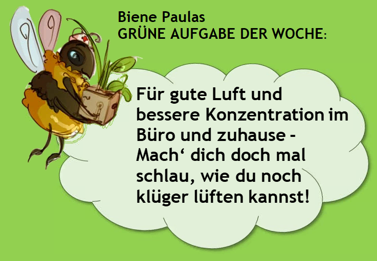 Aus diesem Grund stellt Ihnen die Biene Paule diese Woche folgende Aufgabe: „Für gute Luft und bessere Konzentration im Büro oder Zuhause – Mach dich doch mal schlau, wie du noch klüger lüften kannst!“