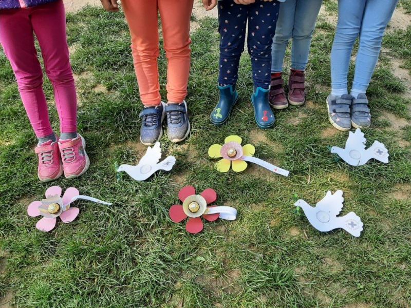 In der Kita Nordlicht und der Kita Villa Kunterbunt war eher die Kreativität und das Geschick der Kleinen gefragt: Es wurden unzählige Friedenstauben gebastelt! Die Kinder aus der Kita Nordlicht machten aus ihren Schmuckstücken eine lange Friedenskette zum Bewundern in den eigenen vier Wänden. Die Friedenstauben aus der Villa Kunterbunt wurden in der Nachbarschaft verteilt und zusammen mit einer selbst gebastelten Blume vor die Türen gelegt.